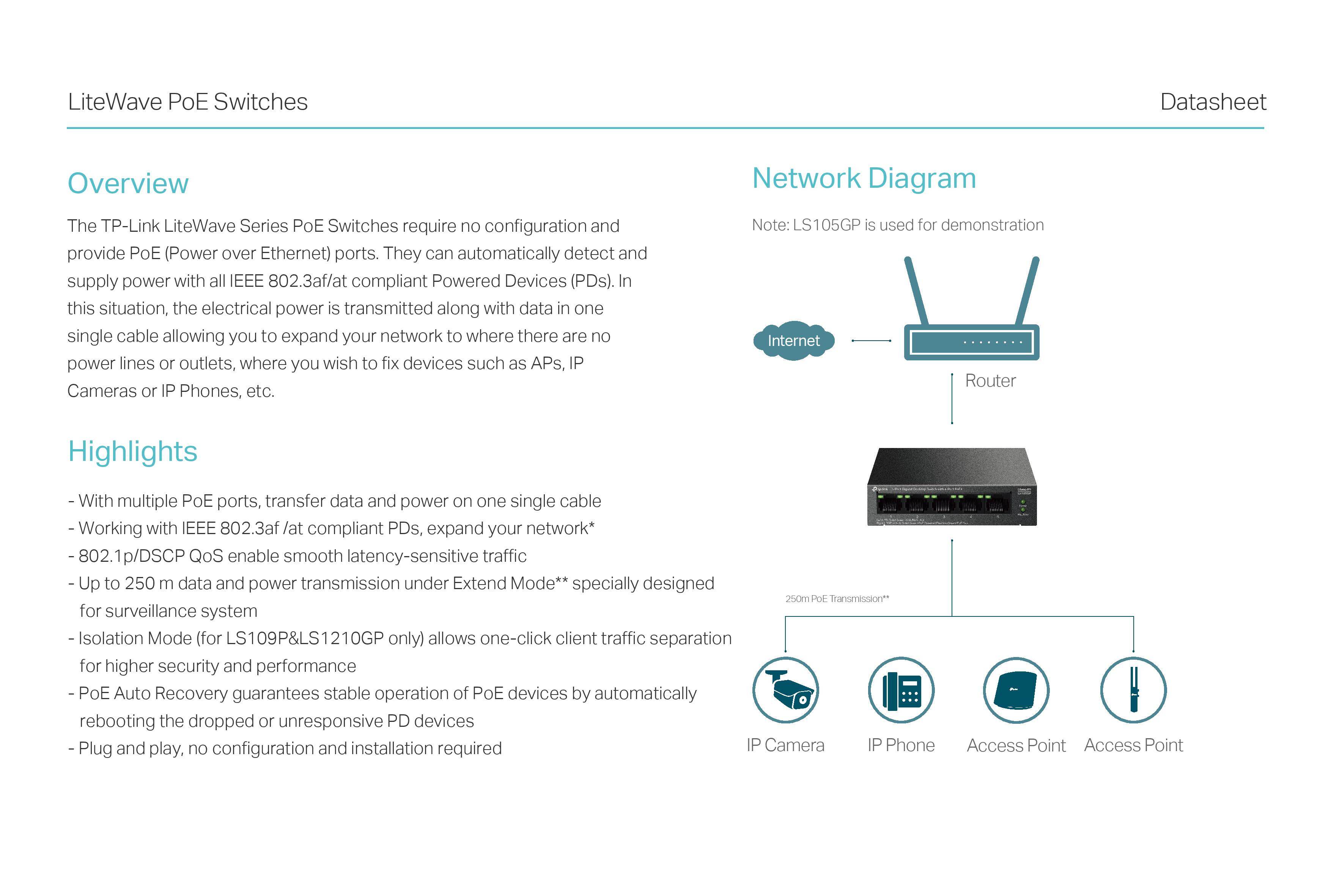 TP-LINK LS105GP Network 5 Port Gigabit Switch With 4 × Gigabit PoE+ Ports 65W PoE Power , 1 × Gigabit Non-PoE Port Desktop Network Switch