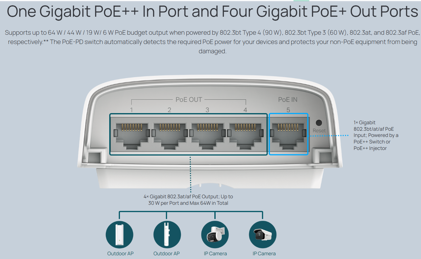 1-Port Gigabit PoE++ In and 4-Port PoE+ Out: Supports up to 64 W / 44 W / 19 W/ 6 W PoE budget output when powered by 802.3bt Type 4 (90 W), 802.3bt Type 3 (60 W), 802.3at, and 802.3af PoE, respectively.**